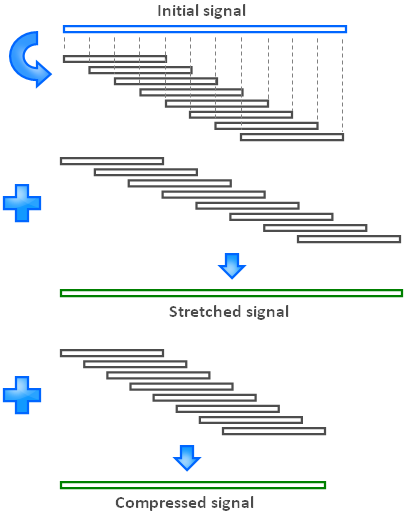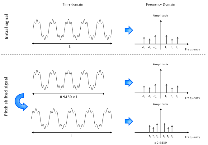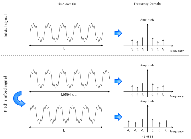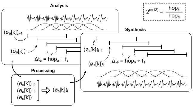3. AlgorithmWe will now look at the algorithm we need to implement from a mathematical point of view. 3.1 What needs to be achievedSo now we know we first have to change the signal duration without changing the pitch. The scaling factor is defined as the factor used to stretch or compress the spectrum in order to adjust the frequencies such that the pitch is shifted. Once this is done, we will perform resampling to return to the initial duration with a shift in the pitch. For instance, if we want to shift the pitch up by one semitone, we need a scaling factor of 2(1/12) which equals to 1.0594. This means we first need to stretch the signal without changing the pitch such that the duration is now multiplied by 1.0594. Once this is done, we need to play the signal 1.0594 times faster.