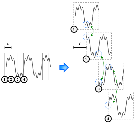 Figure 3.3: Stretching and compressing the signal frame by frame But now we have another problem. When we space the frames differently, this creates discontinuities. This is shown in the next figure (space between frames is initially of length x and becomes of length y).