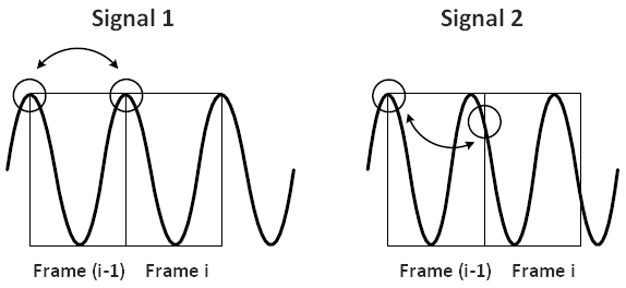 The phase information of the two successive frames is of significant interest. For the first signal, there is no phase difference between the two frames. However, for the second signal, the phase of the first bin is greater than zero. This implies that the signal component corresponding to this bin is higher than the bin frequency. The phase difference between the two frames is referred to as the phase shift