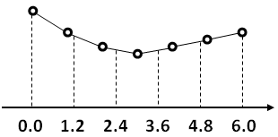 Figure 3.8: Resampling at twice the previous rate Now this is easy because when we double the frequency we deal with a scaling factor that is an integer. If the scaling factor is not an integer (for instance 1.0594 when we shift the pitch up by one semitone), then we cannot use the same technique. We will use instead linear interpolation to approximate the sample that should lie at this location. Linear interpolating also behaves like a low-pass filter and thus removes most of the possible aliasing when we downsample. The next figure shows an example with a scaling factor of 1.2.