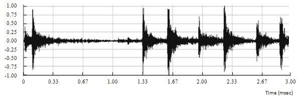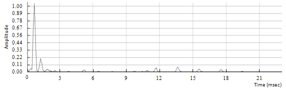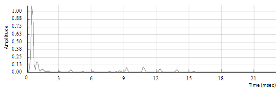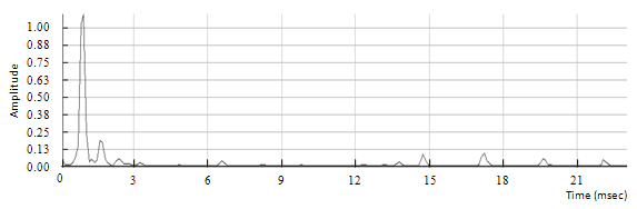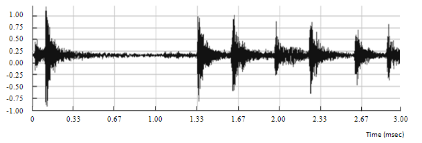 A drum track is used in order to estimate the effect of smearing with the phase vocoder. As a matter of fact, guitar notes played with a sharp attack may be affected by smearing. A drum hit is ideal to estimate the rise time, duration and decay time of a sharp note. This is shown in figures 6.13, 6.14 and 6.15.